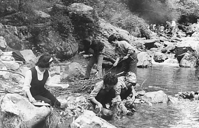 | 1962年葛I伊国屋書店に入社。新人6,7名で都下 秋川渓谷へのハイキングに参加。ランチの支度。 同期に早稲田の英文と東洋史の卒業生がいた。 |