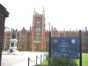 ベルファースト市南部の文教地区でもある The Queen's University of Belfast クイーンズ大学を訪問する。しばらく バスを待ったが予定時刻を20分も過ぎても現れず。限られ た時間で行動していたのでやむなくタクシーを止める。 大学にはすぐ着いた。やはりベルファースト市自体がこじ んまりとした街と言える。チップを入れても3ポンド、¥600 チョッとですんだ。 |